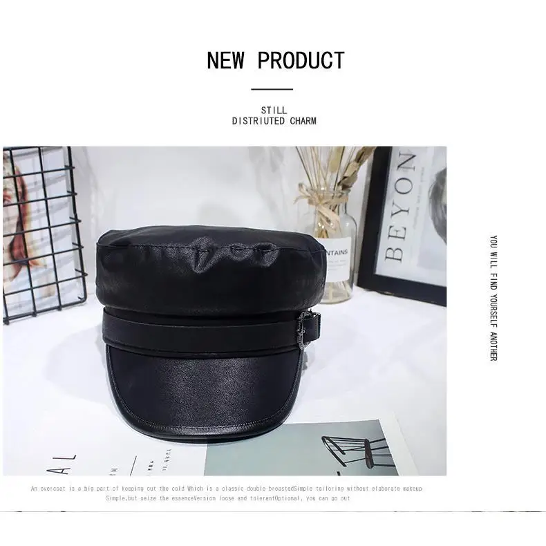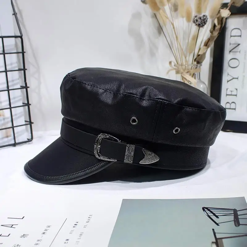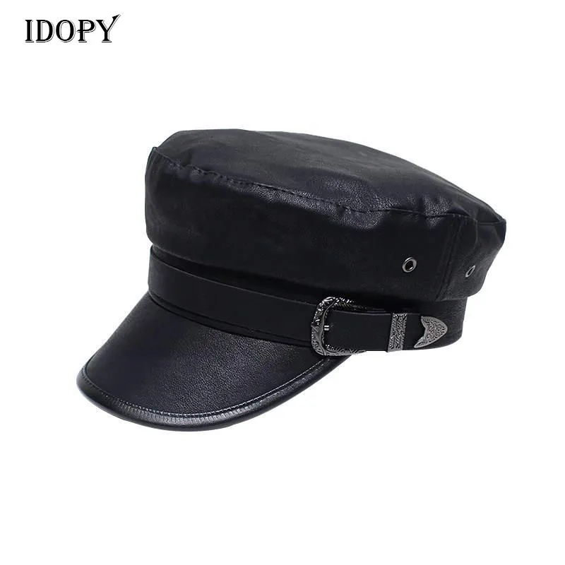 HOT Sale Idopy Casual Faux Leather Cap Woman Pu Leather Beret Flat Hats Captain Cap Trucker Vintage Black Sp