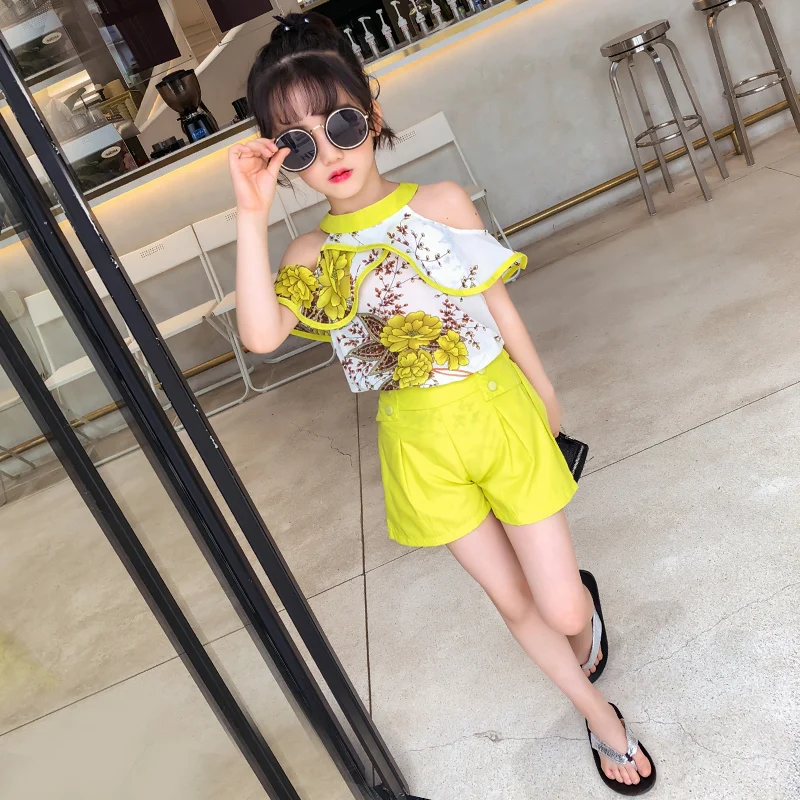 TOP Baby Children Clothes Sets 2019 Girls Fly Sleeve Flower Cotton Shirt + Shorts Summer Set Sport Belt